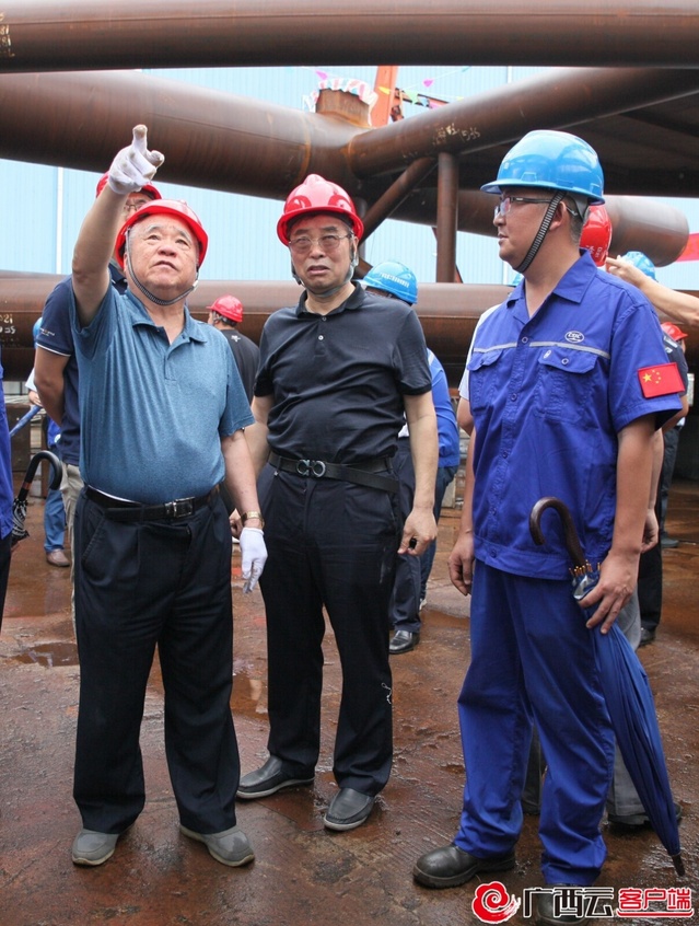 鄭皆連院士(左一)在平南三橋加工制造現場。廣西大學供圖