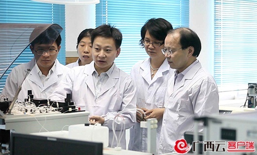 在第八屆中國國際“互聯網+”大學生創新創業大賽斬獲金獎的資源環境與材料學院“九天纜月”本科生團隊,在鄒炳鎖院長等老師的指導下開展實驗研究。廣西大學供圖
