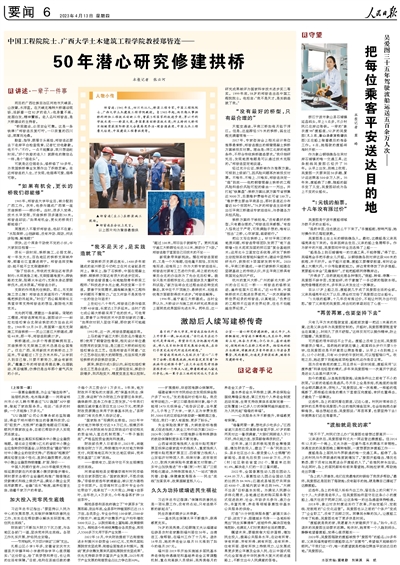 拱橋建成,20多個考察團蜂擁而至。雙曲拱橋無支架施工技術迅速在全國推廣。僅在廣西,采用新技術的拱橋達上萬延米,節省超過1萬立方米木料?!皬膶W別人到自己做,只要不斷努力,就會有新收獲?!彪q笾甑泥嵔赃B再提此事,白眉跳動,笑容鋪展,仿佛仍是當年那個意氣風發的小伙。