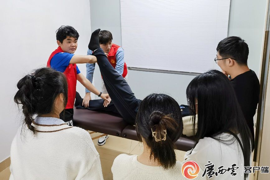 來自體育學院的歐恒瑞、許新悅同學在“一站式”學生社區的健康服務站內,使用理療床、泡沫磚、彈力帶等現代康復器具和傳統推拿手法,為現場同學進行腰椎、頸椎、關節等部位康復理療志愿服務,并傳授日常保健知識和訓練方法。