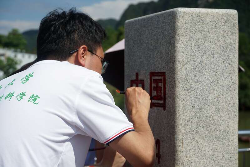 暑假期間,廣西大學資源環(huán)境與材料學院實踐團成員來到廣西大新縣,擦拭836號界碑。陳燕波/攝