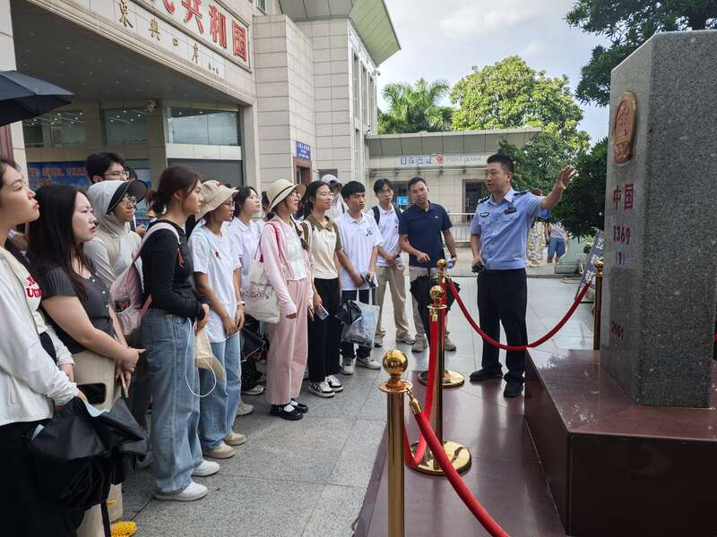 暑假期間,廣西大學化學化工學院實踐團來到廣西東興市,在東興口岸1369號界碑聆聽工作人員講解。陳力源/攝
