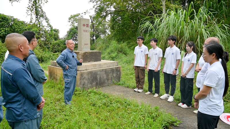 暑假期間,廣西大學電氣工程學院實踐團來到廣西憑祥市,在1083號界碑聆聽工作人員講解。龐皓文/攝