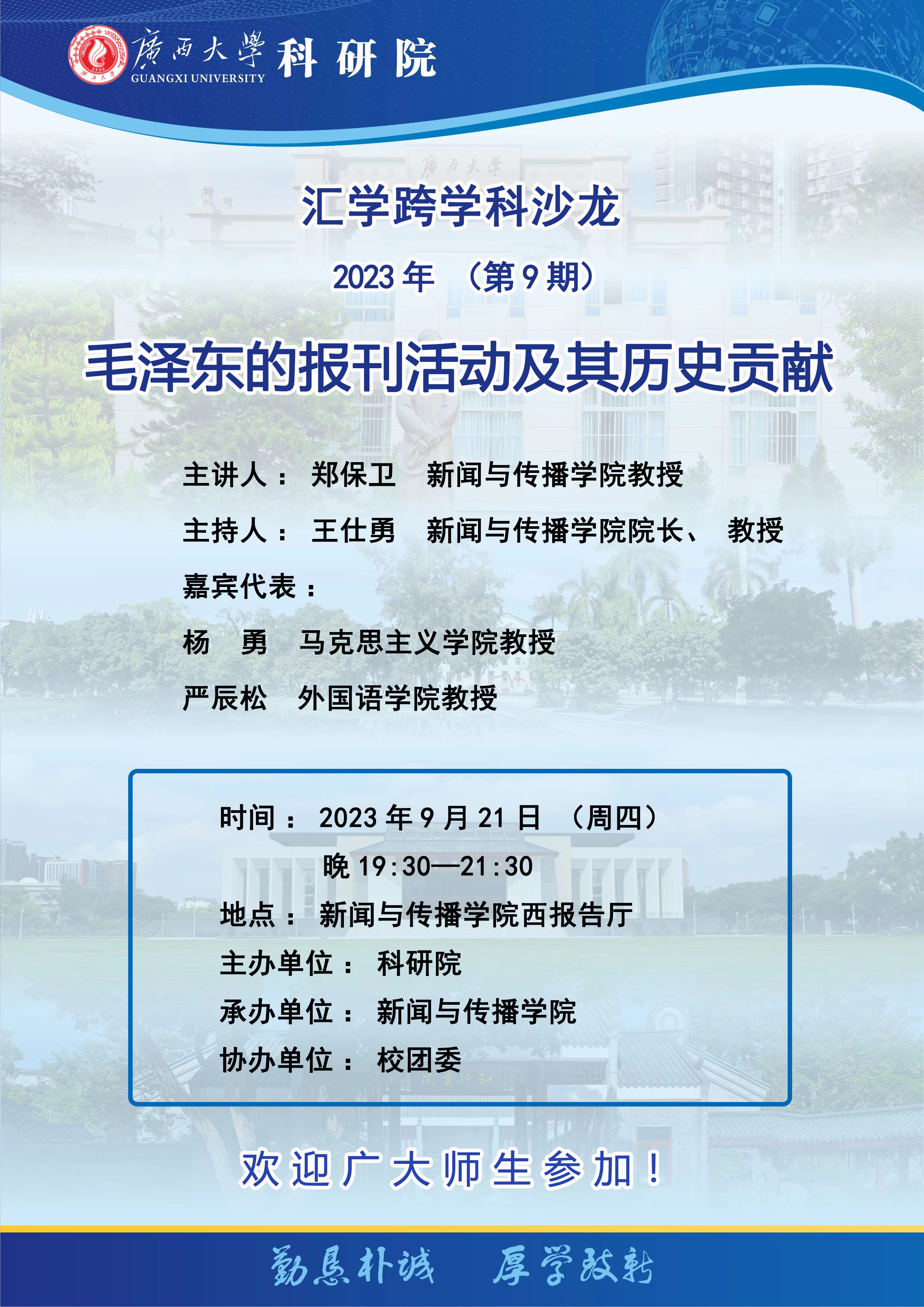 研討內容:今年是毛澤東誕辰130周年。毛澤東一生轟轟烈烈的革命生涯,始終伴隨著豐富多彩的報刊活動實踐。可以說他的革命活動與報刊活動相輔相成,相得益彰,共同成就了他一生波瀾壯闊的偉大事業。毛澤東在長達半個多世紀的革命歷程中,始終關心和重視黨報工作,并創造性地把馬克思、恩格斯、列寧等無產階級革命領袖的黨報理論運用于中國共產黨的新聞工作實踐,提出了一系列黨的新聞宣傳工作的理論觀點和思想原則,形成了他豐富的新聞思想,給我們留下了寶貴的精神遺產。